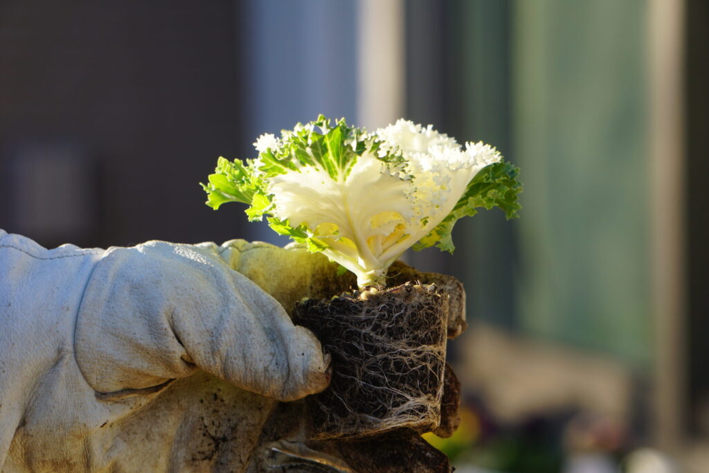 葉牡丹はアルカリ性の土壌を好みます。植え付けの際は培養土に苦土石灰を混ぜると生育が安定します。