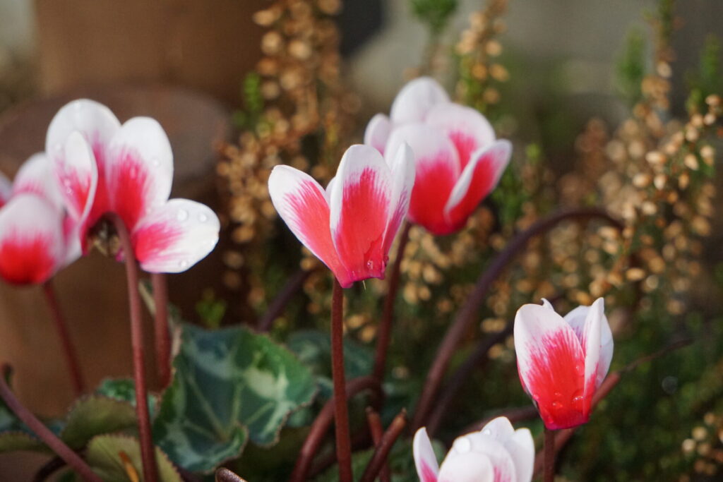コンパクトで寒風に強い、屋外向けの耐寒性シクラメン。冬の花壇でも花数が保てる。
