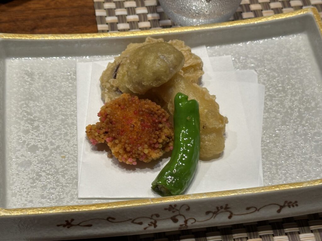夕食は地元の旬の食材を使った会席料理。個室の会場でいただきました。